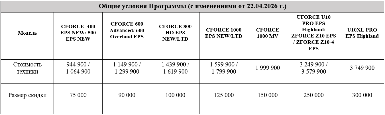Согласно условиям Программы, Вы можете сдать Дилеру CFMOTO в зачет на условиях «ТРЕЙД-ИН» любой квадроцикл ATV или мотовездеход Side-by-Side любого бренда с объемом двигателя свыше 350сс и имеющий ПСМ, при этом Дилер оценивает б/у квадроцикл с учетом его износа и рыночной стоимости и снижает на эту сумму цену на выбранный клиентом новый квадроцикл CFMOTO. Кроме этого, Покупатель получает дополнительную скидку, указанную в таблице: